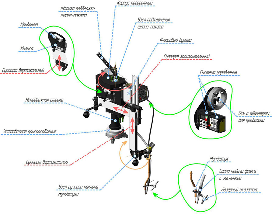 • В зависимости от исполнения предназначена для автоматической сварки под флюсом (Submerged Arc Welding (SAW) процесс) или для автоматической сварки плавящимся электродом в защитном газе (Gas Metal Arc Welding (GMAW) процесс) симметричных или асимметричных швов вварки патрубков в обечайки и днища корпусов сосудов и др. подобных устройств. Широко применяется в процессе изготовления сосудов котельного и нефтегазодобывающего оборудования (КО и НГДО) при вварке арматуры (патрубки, люки и т.п.) в корпус сосудов с большой толщиной стенки.