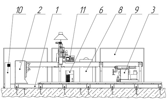 Установка, в соответствии с рисунками, состоит из следующих основных частей: рамы-основания 1, передней приводной неподвижной опоры вращения 2, задней самоходной опоры вращения 3, системы позиционирования сварочной горелки 4, сварочной горелки 5, инверторного сварочного аппарата 6, блока подачи электродной проволоки 7, местного фильтровентиляционного устройства 8, трех светозащитных экранов 9, монтажного шкафа управления 10, пульта управления 11, система вентиляции 12, пульта дистанционного управления, задней самоходной опоры вращения и тележки (на рисунках не показаны).